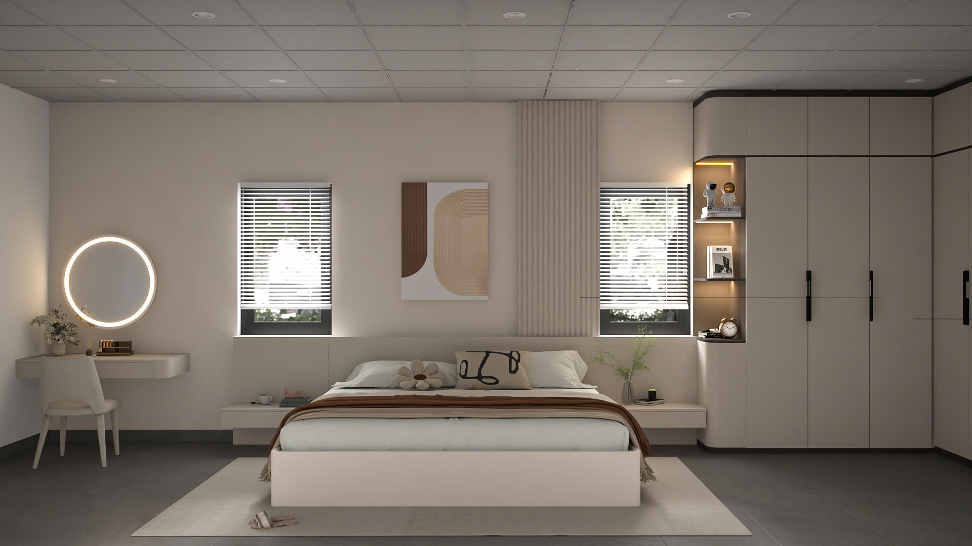 Đặc điểm: Tông màu chủ đạo là trắng, xám nhạt kết hợp với chất liệu gỗ tự nhiên ấm áp và cây xanh. Ánh sáng tự nhiên được khai thác triệt để.